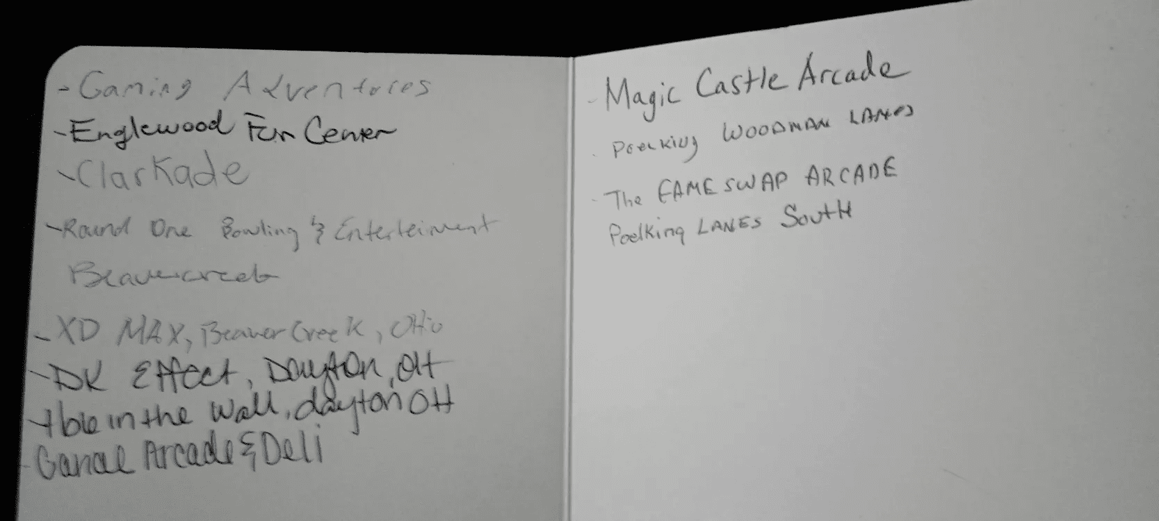 I mentioned this in the prologue, but I got an idea a couple days before I left: Every time I’d stop in an arcade, I’d get one of the workers to write the name of it in the book on my goal toward hitting 50 arcades in one run. Maybe I just wanted to show every arcade that they were being visited by a real enthusiast. Or maybe carrying the arcades I’d visited with me was what kept my motivated while sleeping in the woods for those 10 days.